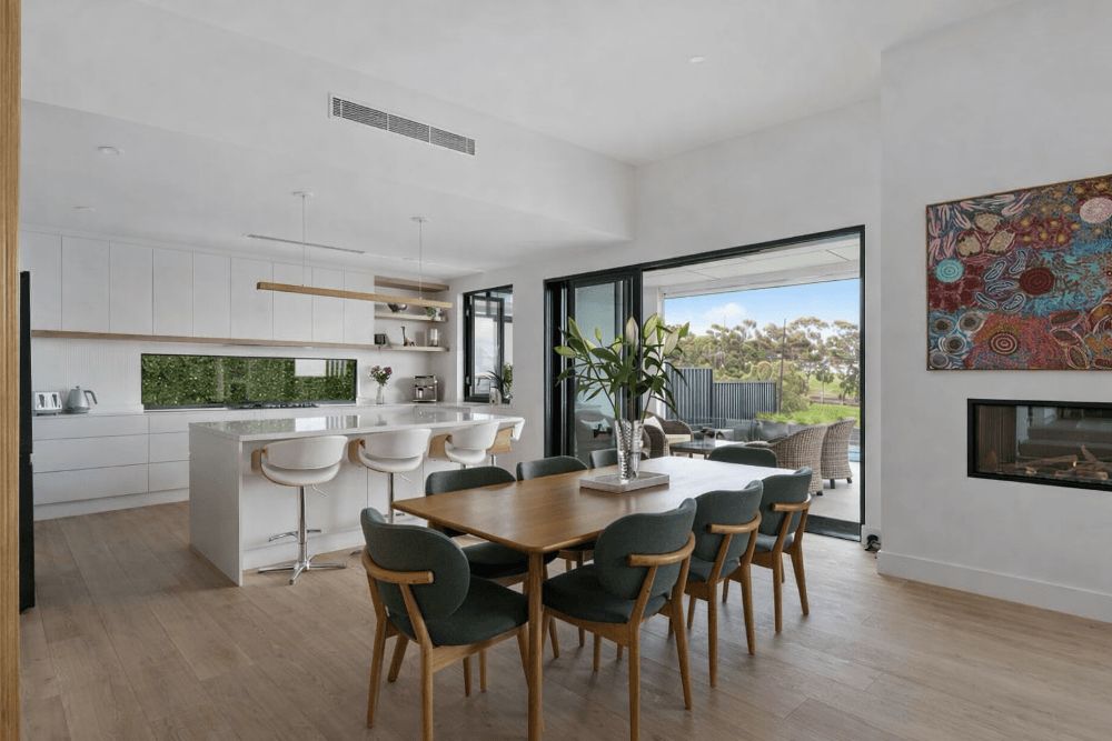 The kitchen sits at the centre of the home, directly connected to the alfresco and main living areas. This layout supports seamless entertaining while maintaining clear sightlines to the surrounding views.
