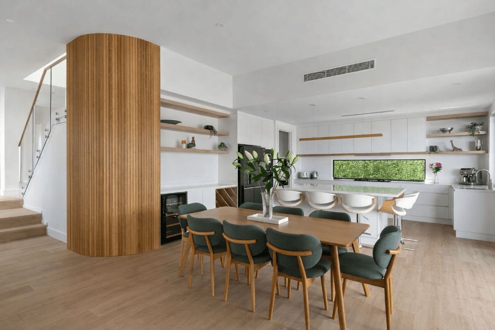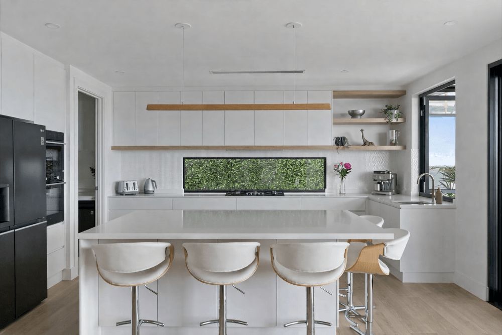 A large island bench anchors the space, providing flexibility for casual dining, working from home, and social gatherings. A concealed walk-in pantry integrates with the adjacent laundry beneath the staircase, maximising storage and functionality without visual clutter.