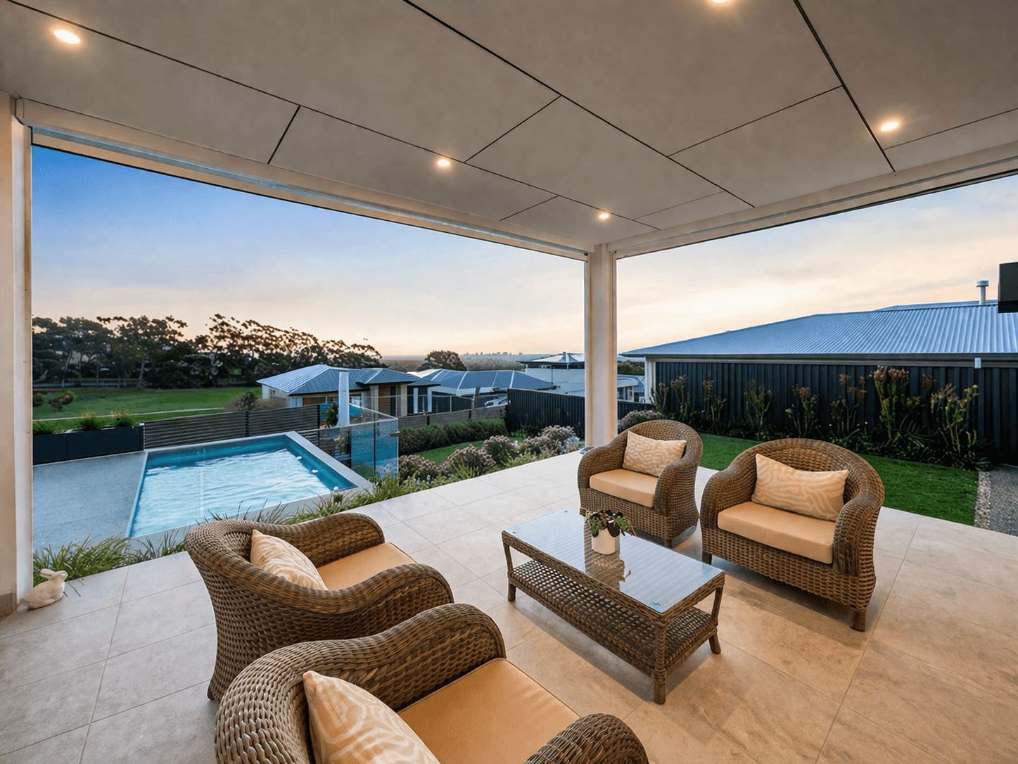 The mineral pool has been carefully positioned below the alfresco area, ensuring uninterrupted views while maintaining a strong connection to the outdoor entertaining zone. Features such as the cocktail ledge enhance usability without compromising the overall design intent.